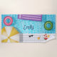 Destei's fun and colourful illustration of a blue summer swimming pool scene. In the pool there is a purple swimming mattress, a green swimming ring and a pink swimming ring. On the bottom of the design there is a white tile floor and on it there are some items. The items are an orange drink with a straw, black sunglasses, yellow and white striped sun shade umbrella and a plate of fruits. The fruits include a watermelon slice, an orange slice and three strawberries. There is also a personalizable text area for a name.