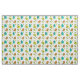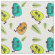 Colourful teardrop camper trailer fabric with repeating tossed pattern of camper trailer images in orange, yellow and teal blue. Accented with green leaf shaped trees.