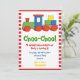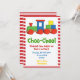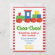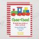 Colourful train kids birthday invitation. This cute and fun design features a train in red, green, blue, yellow and a border with red, white horizontal stripes. On the back there is a red white striped pattern. Some elements by Trina Clark