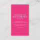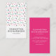 A fun, colourful, but yet professional vertical business card, featuring a pattern of scattered triangles, with white space in bottom third of the card giving name and service details. The reverse side as a popping fuchsia pink background, with business and contact details in white modern font. This design is great for event planners and any other professional.