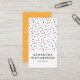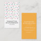 A fun, colourful, but yet professional vertical business card, featuring a pattern of multi-coloured scattered triangles, with white space in bottom third of the card giving name and service details. The reverse side has a happy mustard yellow background, with business and contact details in white modern font. This design is great for event planners and any other professional.