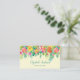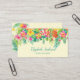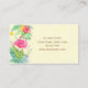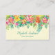 This business card has a colourful border of tropical flowers and greenery on a soft yellow background with a subtle pattern. The back has pink flamingos standing among tropical flowers. This design is suitable for many uses including florists, event planners, travel businesses, etc.