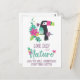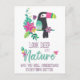 This postcard features a lovely tropical print in vivid colours, with a cute cartoon toucan, colourful tropical leaves and flowers, and a little pink bird.