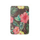 Watercolor hibiscuses and leaves on a dark background create a tropical oasis in a pattern.