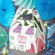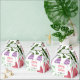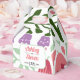 This wedding favour box features a colourful and bohemian design, with retro branches adorned with folklore-inspired flowers. The design also includes a frame that showcases the names of the couple in bold typography. The colour palette of this design is a beautiful blend of dark and mint green, peach, lilac, and magenta, adding a touch of whimsy and charm to any wedding celebration.