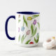The product design features a pattern of colourful tulip flowers in purple, red, pink, blue, and yellow. This botanical illustration makes a modern and unique coffee mug - Gift idea for birthday, Easter, Mother’s Day, wedding, and more!