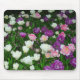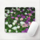A photo of tulips in white, pink and purple interspersed with other little flowers and leaves.
