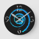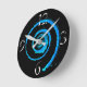 Wall clock with image an abstract image of a light blue twirl on black, on the face of the clock. Customisable.