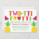 Are you looking for a two-tti frutti invitation for your little girls 2nd birthday? This colourful and simple invitation is a great way to invitation your little one's guests. It features a colourful heading made up of letters and fruit, some pineapples and watercolor pieces. The background is a crisp white. The back of the invitation features a pattern consisting for the watermelon slice and pineapple. This colourful girl's two-tii frutti invitation is ready to be personalised. For more designs in this theme please visit the store.