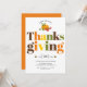 Colourful typography pumpkin fall Thanksgiving invitation. A modern design that displays the text "Thanksgiving' in colourful typography style and a pumpkin. Colours:brown, orange, yellow, olive green. The back is of solid orange colour.