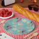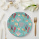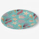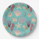 Colourful watercolor illustrations of seashells and underwater plant life create a pattern on aqua background