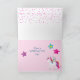 Here's a cute birthday card for any child, but especially for a little girl. A cute white unicorn with pink, blue, and yellow striped mane and tail rears playfully on the front of the card. Behind the unicorn is a matching rainbow between two white clouds. Your custom text is in white at the lower right. Everything is placed on a pastel blue background with pink and white confetti. The inside of the card has another image of the little unicorn, with several bright stars on a pale pink background.