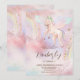 A colourful watercolor unicorn with outstretched wings stands in front of a pink background sprinkled with gold stars.