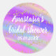 Personalised round sticker for a bridal shower. This glam sticker features elegant white writing, with a colourful unicorn rainbow background, and gold glitter sparkles confetti. You can personalise it with your name and bridal shower date. You can even change the text colour and font style using the customise option.