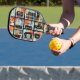 Colourful urban graffiti patchwork pattern pickleball paddle featuring bold abstract blocks, expressive brush strokes, scribbles, stars, and mixed-media textures in bright blue, yellow, pink, orange, and black. Energetic and edgy with a modern street art aesthetic, this seamless design is ideal for graffiti art lovers, maximalist style fans, creative teens, and contemporary art enthusiasts.