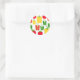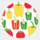 A bright and colourful pattern of fruit and vegetables, there are bell pepper vegetables and tomatoes. The veg is in green, bright red and yellow. Bell peppers are also sometimes known as sweet peppers or capsicum. Bell peppers are can be considered to be fruits but are often referred to as being vegetables.