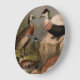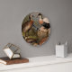 A classical painting in full colour, depicting six ducks, both male and female. The birds are standing next to a creek, some on tufts of grass, some on rocks. One male duck is swimming in the water in the middle of the painting. All the animals are painted in luscious greens, browns, dewy whites and shades of black.