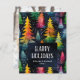 Christmas holiday photo greeting card featuring a pattern of colourful Christmas trees on a dark blue background. Whimsical text "Happy Holidays" and your custom names and year.