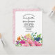 Beautiful botanical and colourful yellow, pink, blue, purple, and orange watercolor floral and green leaves garden-style wedding invitation on white with a pink and white cloud back.
