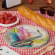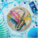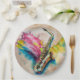 A watercolor painting of a colourful splash with a saxophone in the centre. The splash has shades of blue, purple, and yellow. The background is a calm body of water with a reflection of the sky and the surroundings. The sky has clouds and is painted with a gradient of blue and purple.