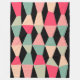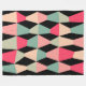 An original abstract design made up of columns of wedge like shapes in alternating in colours and tones in a palette of five harmonious colours.