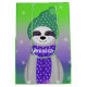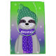 Colourful Winter Sloth Design Gift Bag with customisable background colour (on sides and bottom) and text.