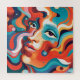 Vibrant colours swirl together to create an abstract representation of a female face. Bold reds, blues, oranges, and teals blend harmoniously, outlining expressive eyes and lips amidst a sea of abstract shapes.