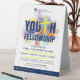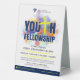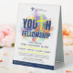 Promote your church's youth fellowship service events with this minimalist fun and colourful table tent sign featuring paint splatters, a yellow cross, and blue typography. Customise to your liking.