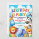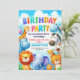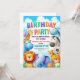 Invite your child's friends to an unforgettable zoo-themed birthday party with this adorable invitation featuring a joyful group of zoo animals under a bright, blue sky. Perfect for animal-loving kids, this charming design sets a fun, adventurous tone for any celebration.