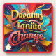 A vibrant design featuring the text "Dreams Ignite Change" in a dazzling array of colours, accented with golden touches that shimmer like stars. The bold typography is surrounded by abstract shapes and swirling patterns, symbolising the energy and potential of creativity. This piece inspires viewers to embrace their aspirations and transform them into reality."Original Image was generated by Meta AI. AI generated artwork. Licensed under CC BY-SA 4.0.
