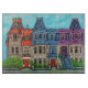 Vibrant, stylised painting of the colourful Victorian row houses on Saint-Louis Square in The Plateau district of Montreal, Quebec, Lisa Lorenz on a cutting board.
