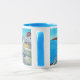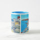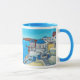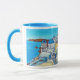 Vibrant, stylised painting of beautiful Santorini, Greece with its majestic blue dome by popular artist Lisa Lorenz on a mug.