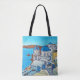 Vibrant, stylised painting of beautiful Santorini, Greece with its majestic blue dome by popular artist Lisa Lorenz on stylish shoulder tote bag.