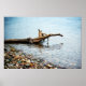 A photograph of a dead tree washed a shore to a rocky beach.