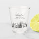 Modern Columbus wedding skyline shot glass favour gift with "cheers" script. The design showcases a stunning sketch with the ability to customise your names and exact location. Enter the Zazzle design tool for additional customisations.