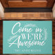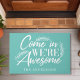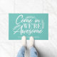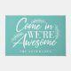Come In We're Awesome Teal Funny Family Doormat. This rustic door mat features a modern script with rustic laurel olive branch accents. Personalise this funny custom design with your own family name. Makes the perfect housewarming gift.