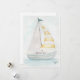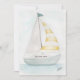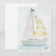 Watercolor painting of a modern sailboat with a yellow and white striped sail