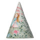 A watercolor painted children's party invitation featuring a rabbit pouring tea and your host with her pet flamingo and a vine full of pastries and teacups waiting for guests to arrive to the party.