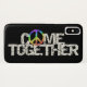 Promote peace, unity, tolerance and understanding with this unique design. Love is love. The words "Come Together" are set in a cream coloured grunge style typeface with the "o" being formed from a peace symbol with a rainbow tie-dye effect.