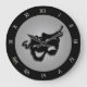 Beautiful design with the Greek theatre masks of comedy and tragedy on a silver clock face. White Roman numerals