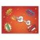Bold, bright pop art / comic book exclamations: pow, wow, omg, poof, and bang. Red and orange background.