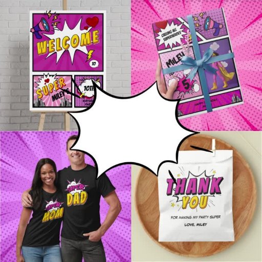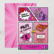 Designed to capture the magic of comic books while adding a sprinkle of cuteness, our invitation features dynamic comic-style graphics in shades of pink and purple. From powerful speech bubbles to adorable action scenes, every detail is crafted to delight and inspire the imagination.