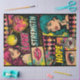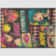 Bright hot pink, teal, yellow, and black create a high-contrast pop art look with grunge splatter effects and vintage comic-inspired elements. The vertical layout makes it ideal for furniture panels, drawer fronts, and statement pieces.