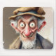 Delightful caricature of an elderly man featuring expressive bulging eyeballs and a scraggly white beard, adorned with a charming brown cap and coat, beautifully rendered in watercolor
