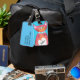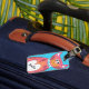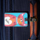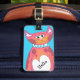 Colourful fun luggage tag, with cartoon graphics of a pink, white, and orange comical cat, against a sky blue background decorating the front of the tag. The back of the tag is done in sky blue, with custom black text. Personalise all the text to read what you want.