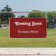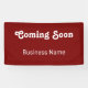Coming Soon is in a decorative font above additional text for your business. This deep red banner has white text that can be edited or deleted.