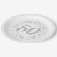 Commemorative birthday celebration party plate with person's name, and the date of their birthday. A paper plate for someone who is 50.
