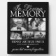 Personalised family memorial plaque featuring a stylish black background that can be changed to any colour, 5 photos of your lost loved one, the text "in loving memory", their name, birth/death dates, a white heart, and the remembrance saying "gone but never forgotten".