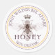 An elegant honey label featuring a beautiful ghosted double bee graphic logo in earthy brown and yellow gold, for a commercial honey beekeeping apiary.