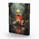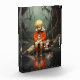 A young boy in a red jacket sits on a rock by a quiet, reflective water body, accompanied by his dog. The boy seems saddened and his faithful companion is commiserating with him. The scene is set in a mystical forest with a tranquil ambiance.